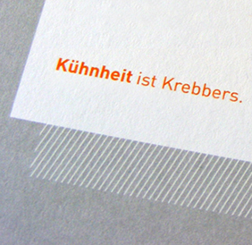 Grund genug, mit einem ambitionierten Mailing jetzt ausgewählte Architekten aufzufordern, durch Kühnheit, Konsequenz und Wagemut aufzufallen. Konzipiert und gestaltet von OrangeLab. Und bereits goutiert von denen, die es gut finden sollen. „Sehr schöne Präsentation.“ schreibt einer. Und „Da möchte ich gerne nochmal kühn sein.“ ein anderer. So kommt Krebbers ins Gespräch – und an neue Aufträge.